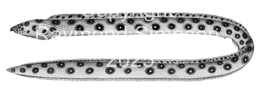 Body gray grading to whitish on the belly. Body and head with large, round, diffuse black ocelli with bright yellow centers. Spots on snout are smaller in size but the same coloration. Dorsal fin gray with black spots and white edge. Eye whitish.