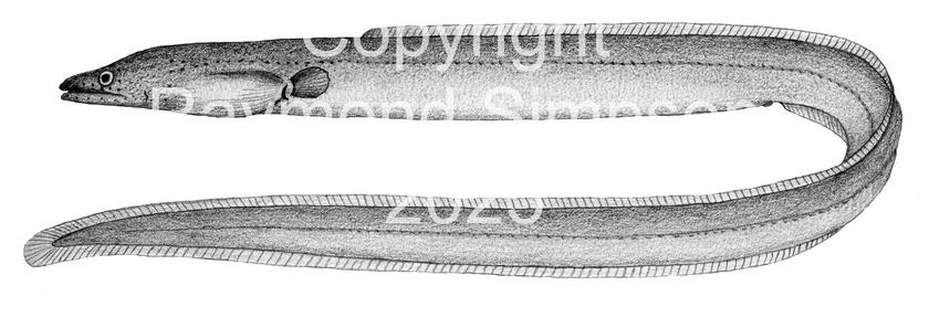 Body elongate and laterally compressed. Trunk shorter than tail. Snout short, bluntly rounded and overhangs mouth. Eye over middle of jaw. Underside of snout without groove. Anterior nostril a well developed tube. Posterior nostril a small slit in upper lip under anterior eye. Teeth small and conical. Two rows of teeth on maxillary (25-30 outer, 15-16 inner) and dentary (26-30 outer and 18-20 inner). Intermaxillary teeth present (9-11) in a rounded patch connected to vomerine row. Vomer with one row of teeth (12-16). Gill openings small on lower side. Dorsal fin origin about as far as 1-2 pectoral fin lengths from gill slit or less than twice head length. Anal fin present. Dorsal and anal fins low and continuous around the tail. Anal fin higher than dorsal fin. Pectoral fin well developed (2X orbit) and rounded. Lateral line complete with only anterior pores easily visible. Head pores well developed. One postorbital pore.