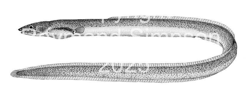 Body elongate and laterally compressed. Trunk shorter than tail. Snout short, bluntly rounded and overhangs mouth. Eye over middle of jaw. Underside of snout without groove. Anterior nostril a well developed tube. Posterior nostril a small slit in upper lip under anterior eye. Teeth small and conical. Two rows of teeth on maxillary (19-31 outer, 11-14 inner)) and dentary (23-36 outer and 6-10 inner). Intermaxillary teeth present (9-10) in a rounded patch connected to vomerine row. Vomer with one row of teeth (14-18). Gill openings small on lower side. Dorsal fin origin well behind gill slit (halfway between snout tip and anus). Anal fin present. Dorsal and anal fins low and continuous around the tail. Anal fin higher than dorsal fin. Pectoral fin well developed (2X orbit) and rounded. Lateral line complete with only anterior pores easily visible. Head pores well developed. Two postorbital pores